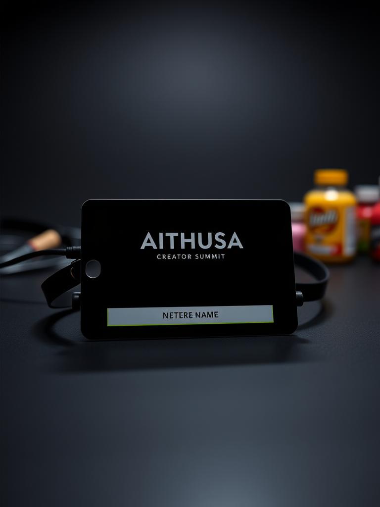 Crachás e lanyards para Creator Summit e eventos oficiais. Alumínio anodizado com identidade obsidian e acento lime disciplinado.