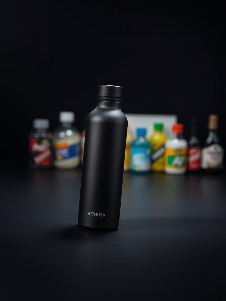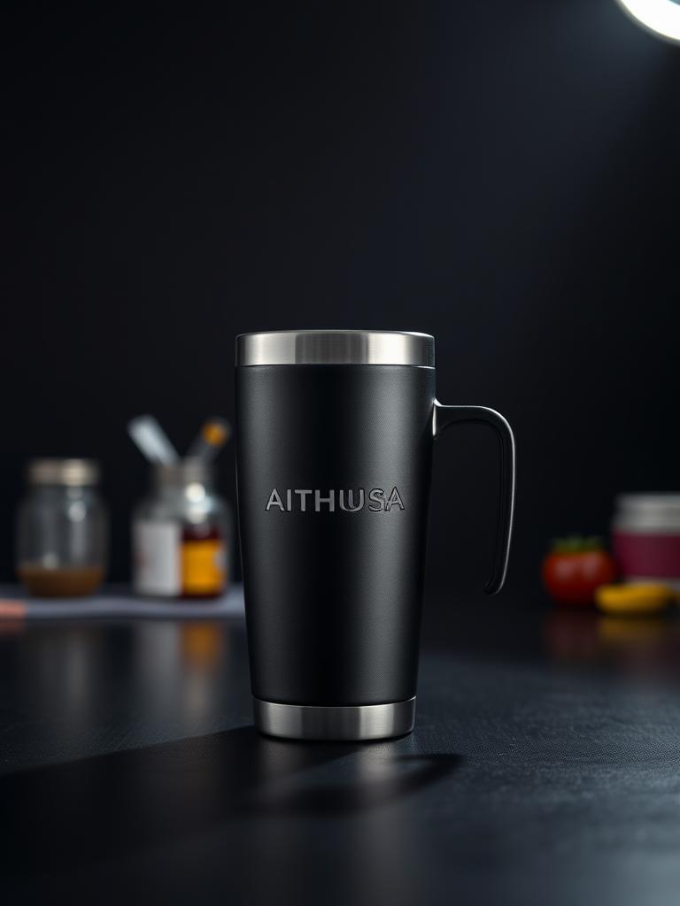 Garrafas e canecas que marcam presença no setup e nos eventos. Aço inox 18/8 com tratamento matte obsidian e gravação laser AITHUSA.