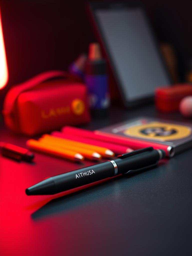 Sistema completo de objetos físicos Aithusa: papelaria, drinkware, desk setup, cases e identidade de eventos. Cada peça com peso real, não brinde genérico.